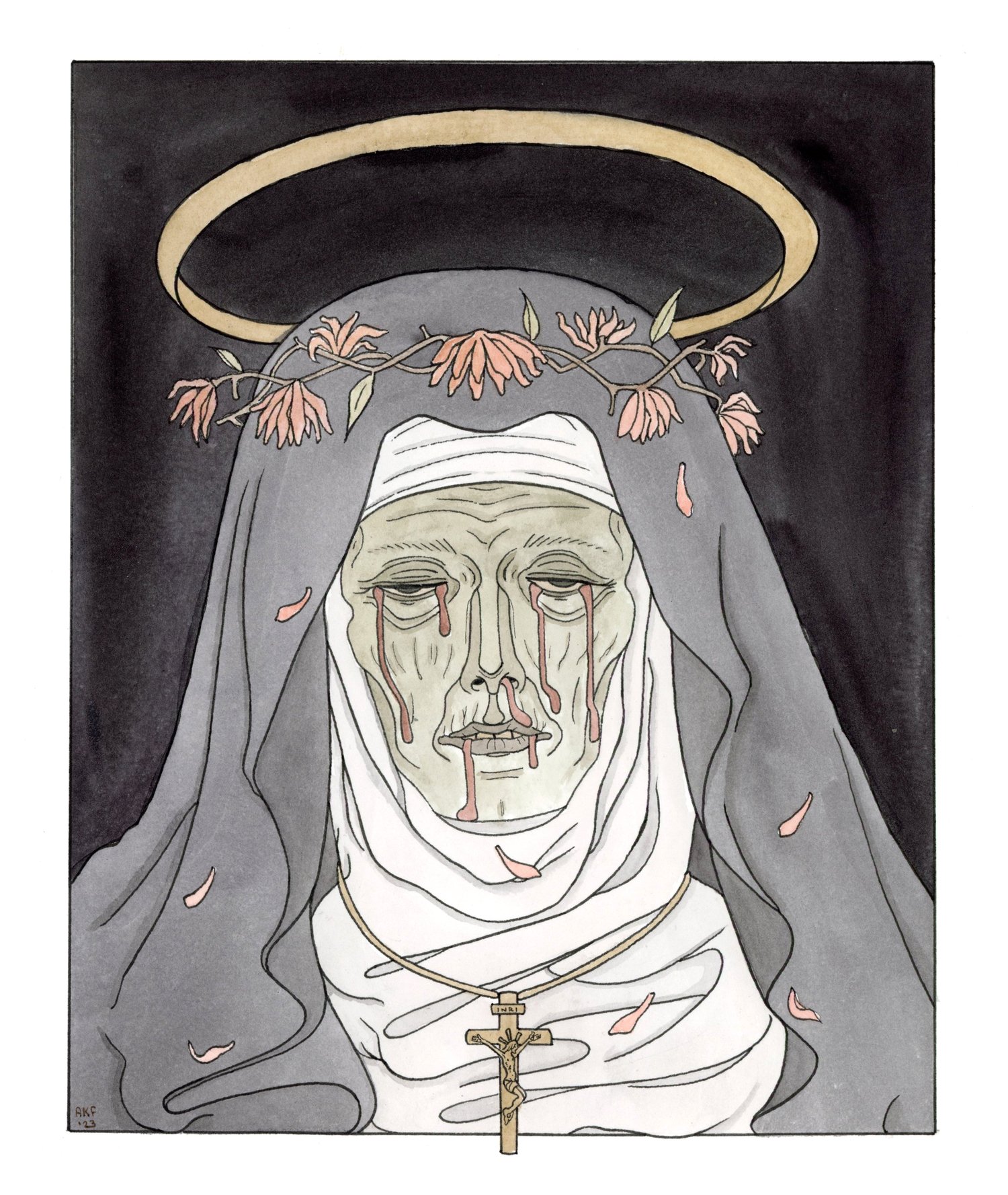 Andrew specializes in working with watercolor and pen & ink. His subject matter is diverse, but there are themes he enjoys returning to. Andrew loves to depict religious figures, frogs, spellcasters, regal ladies and scenes of unapologetic homoeroticism. Through art he likes to explore the fantastical and everyday situations all with a touch of humor.