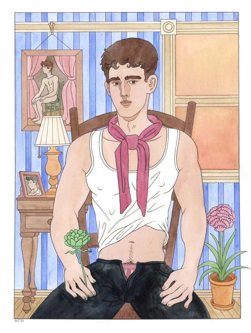 Andrew specializes in working with watercolor and pen & ink. His subject matter is diverse, but there are themes he enjoys returning to. Andrew loves to depict religious figures, frogs, spellcasters, regal ladies and scenes of unapologetic homoeroticism. Through art he likes to explore the fantastical and everyday situations all with a touch of humor.
